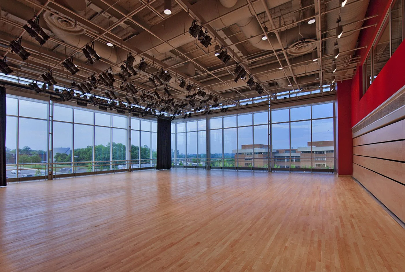 1000 Hilltop Circle | Baltimore, MD 21250The Dance Cube (3,500 sq. ft) has two glass walls with a view of Baltimore, a basket-weave sprung floor, and retractable risers that allow the space to be converted into a performance venue seating approximately 100 people. It is fully equipped with state of the art lighting and AV systems.